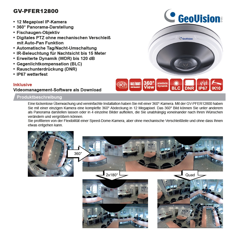 GV-PFER12800 = 12MP Fischauge IP Kamera LAN PoE IP67 360° Fisheye IR-LED H265 H264 Outdoor