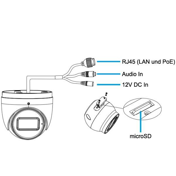 - Anschlüsse: LAN (RJ45 mit PoE ), Kartenslot (microSD), 1 x Audio In.