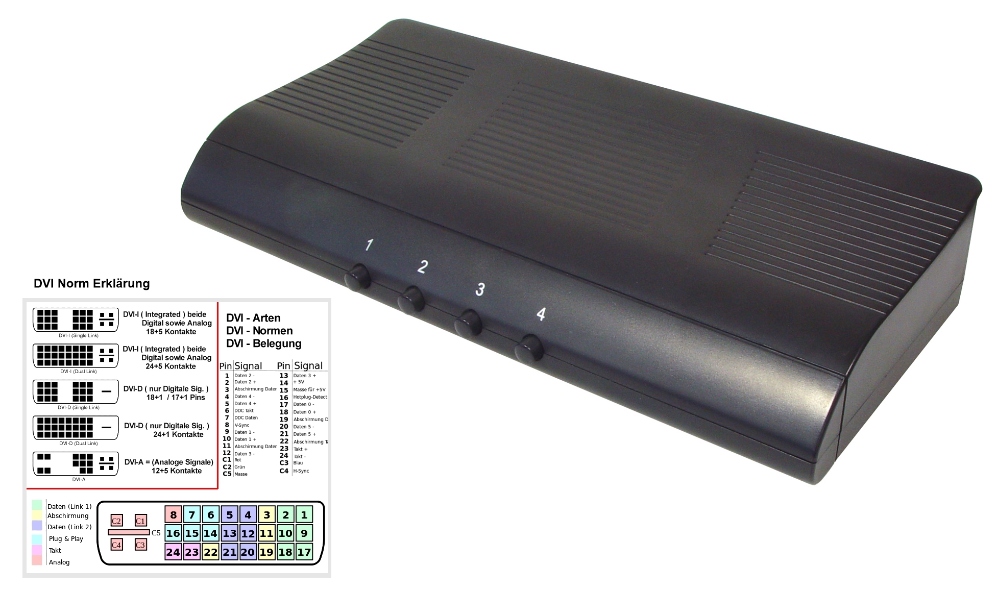Dieser DVI Umschalter ist die ideale Lösung, wenn in einer Anlage mehrere Quellen mit DVI-Ausgang vorhanden sind, die an ein DVI Wiedergabegerät angeschlossen werden sollen.