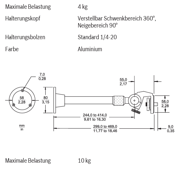 Produktinformationen "Kamerahalter Aluminium mit 240-469mm Ausleger variabel und Kugelkopf Einsatz bis 10Kg"