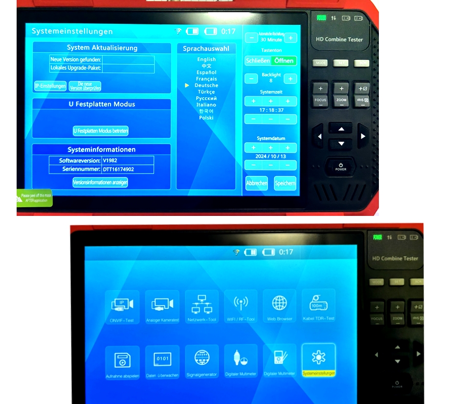 Ideal für Servicetechniker, Industrie z.B. für Maschienekameras und Handwerk Kamera Universalfunktionstester für IP (bis 4K), TVI (bis 8Mpx) , CVI (bis 8 Mpx), AHD (bis 5Mpx) und Analog CVBS Video Signal mit automatische Anpassung an das Eingangssignal Universalfuntionale Kameraanlagen Tester, kompatibel mit IP, TVI, CVI, AHD und analogen CVBS-Kameras. Komplettes Werkzeug für die professionelle Instalation und Aufrechterhaltung von Kameratechnik. Ein Integrierter 7zoll Touchscreen mit eine Auflösung von 1920x1200.