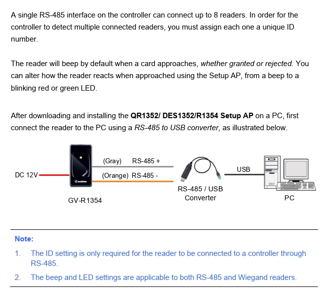 + Die RS485-Schnittstelle unterstützt ausschließlich GeoVision-Controller, während die Wiegand-Schnittstelle sowohl GeoVision- als auch Drittanbieter-Controller unterstützt (Wiegand 26 Bit).