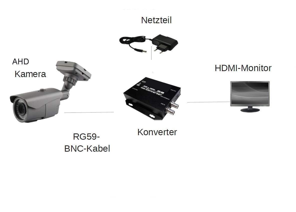 Wandler für den Anschluss einer HD AHD Kamera an einen Monitor oder Fernsehgerät mit HDMI Eingang