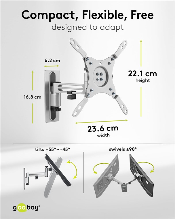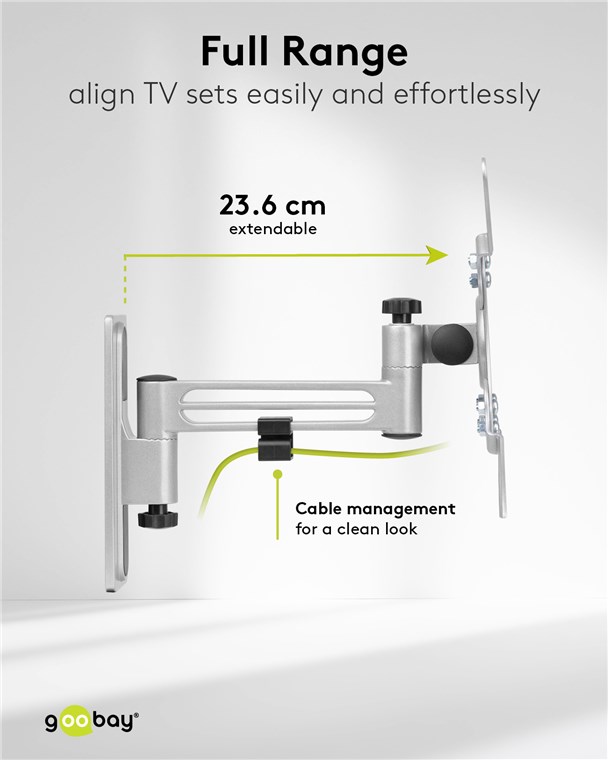 TV-Wandhalterung ideal für Womo Wohnmobil Caravan Wohnwagen. Silberfarbene Halterung für Fernseher von 13 bis 43 Zoll (33 – 109 cm), max. 15 kg, vollbeweglich: schwenkbar und neigbar. Für besondere Flexibilität um bis zu 23,6 cm ausziehbar