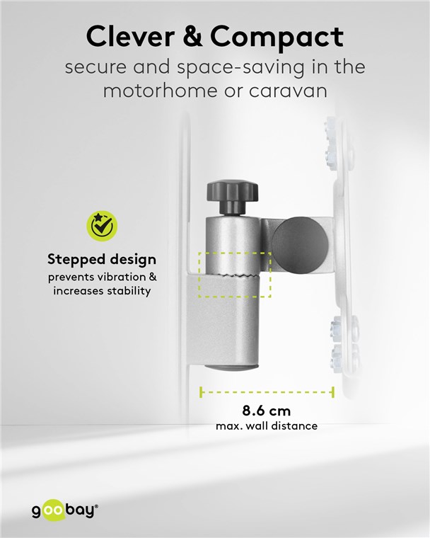 Entworfen für den Einsatz im Wohnmobil oder Wohnwagen, verfügt der Wandhalter über einen Verriegelungsmechanismus und ein Anti-Vibrationsgelenk für sicheren Schutz während der Fahrt Perfekt für die stabile Wandmontage eines mittelgroßen Fernsehers bis 15 kg,