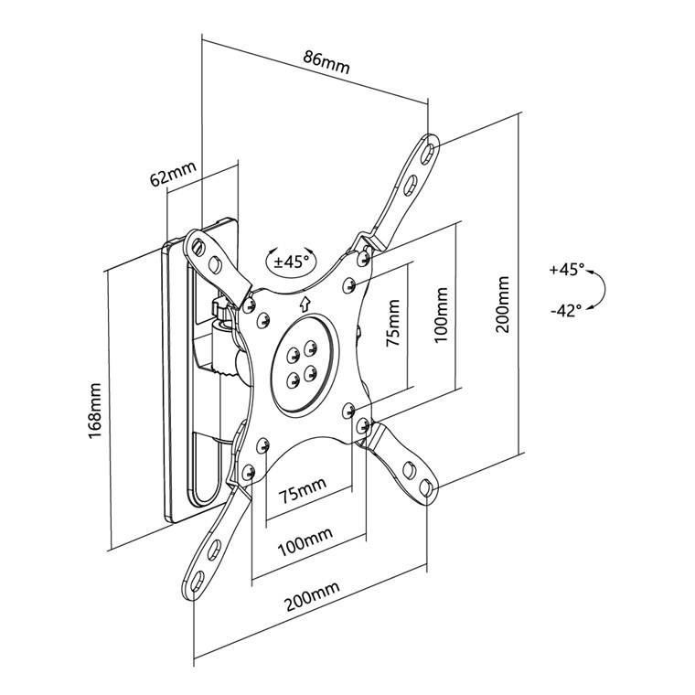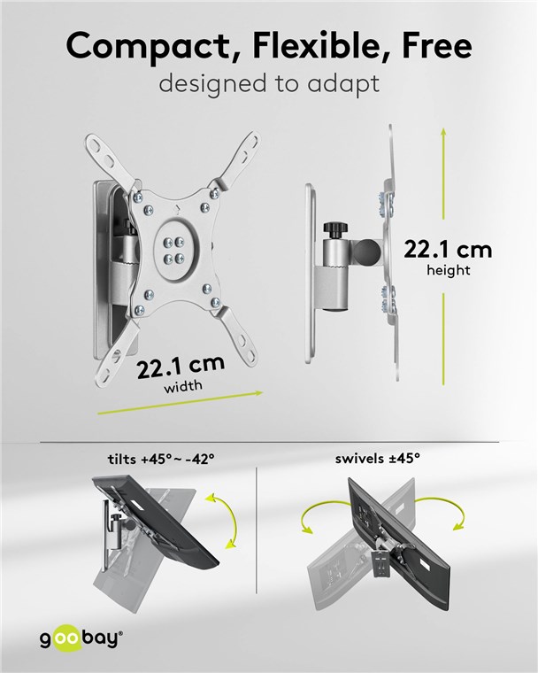 Entworfen für den Einsatz im Wohnmobil oder Wohnwagen, verfügt der Wandhalter über einen Verriegelungsmechanismus und ein Anti-Vibrationsgelenk für sicheren Schutz während der Fahrt Perfekt für die stabile Wandmontage eines mittelgroßen Fernsehers bis 15 kg, für den idealen Blickwinkel +45/-42° neigbar und +/- 45° schwenkbar